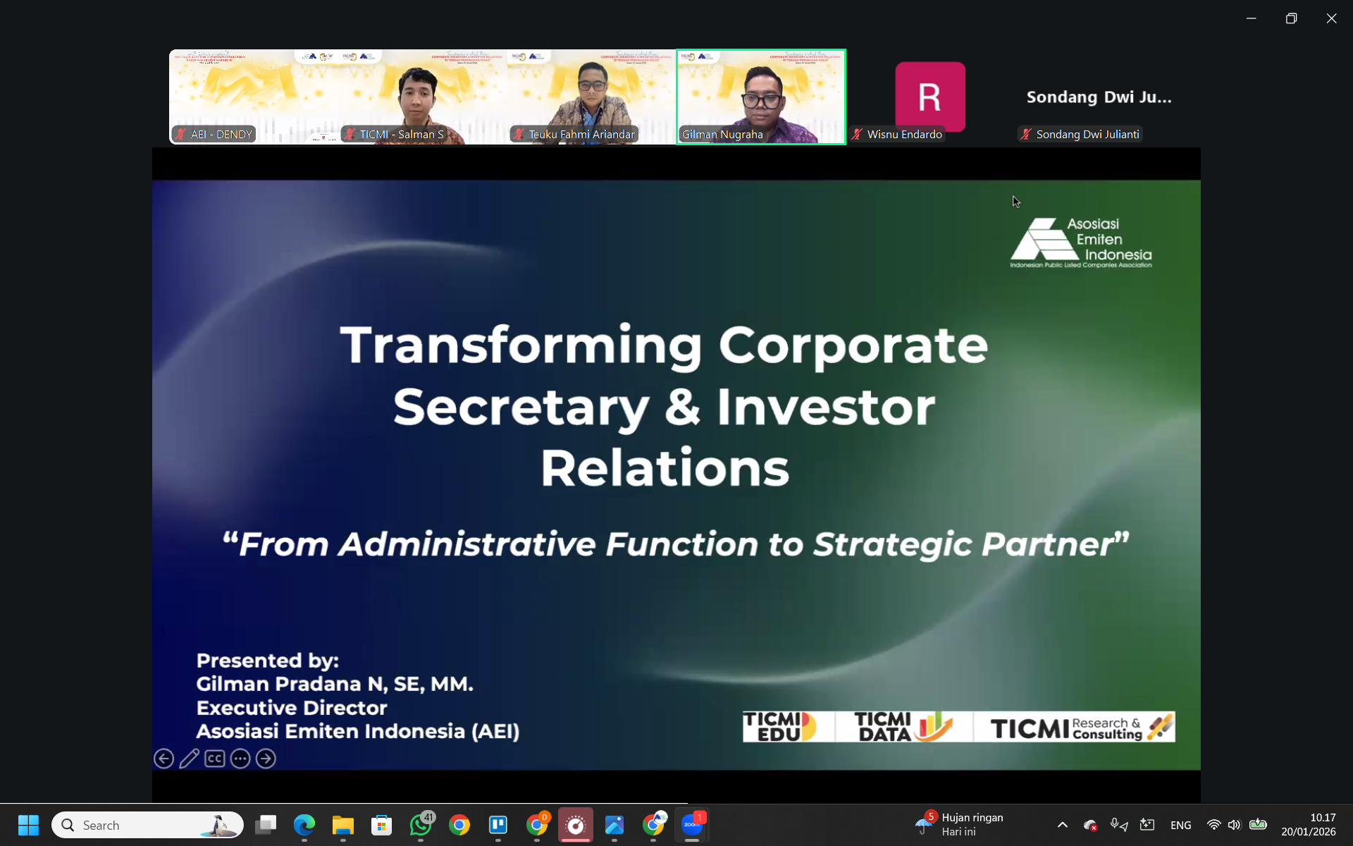 Jakarta, January 20, 2026 — The Indonesian Listed Companies Association (Asosiasi Emiten Indonesia/AEI) participated as a speaker in a webinar organized by The Indonesia Capital Market Institute (TICMI) entitled “Transformation and the New Direction of Corporate Secretary & Investor Relations Amid Market Changes,” which was conducted online on Tuesday, January 20, 2026.