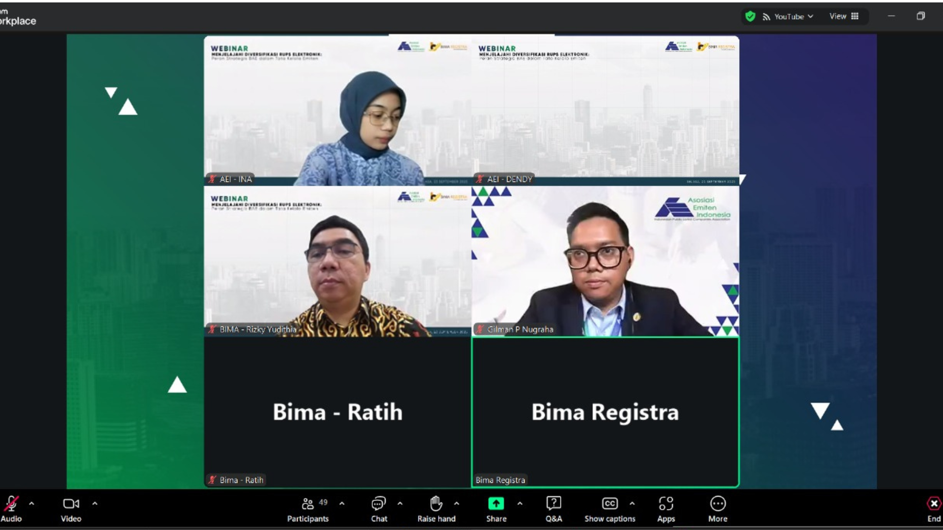 Jakarta, 23 September 2025 – Asosiasi Emiten Indonesia (AEI) bekerja sama dengan PT Bima Registra menyelenggarakan webinar bertajuk “Menjelajahi Diversifikasi Solusi RUPS Elektronik: Peran Strategis BAE dalam Tata Kelola Emiten” pada Selasa (23/9). Acara ini diikuti oleh para anggota AEI yang merupakan perusahaan-perusahaan tercatat di Bursa Efek Indonesia, serta pemangku kepentingan lainnya yang tertarik pada pengembangan tata kelola perusahaan.