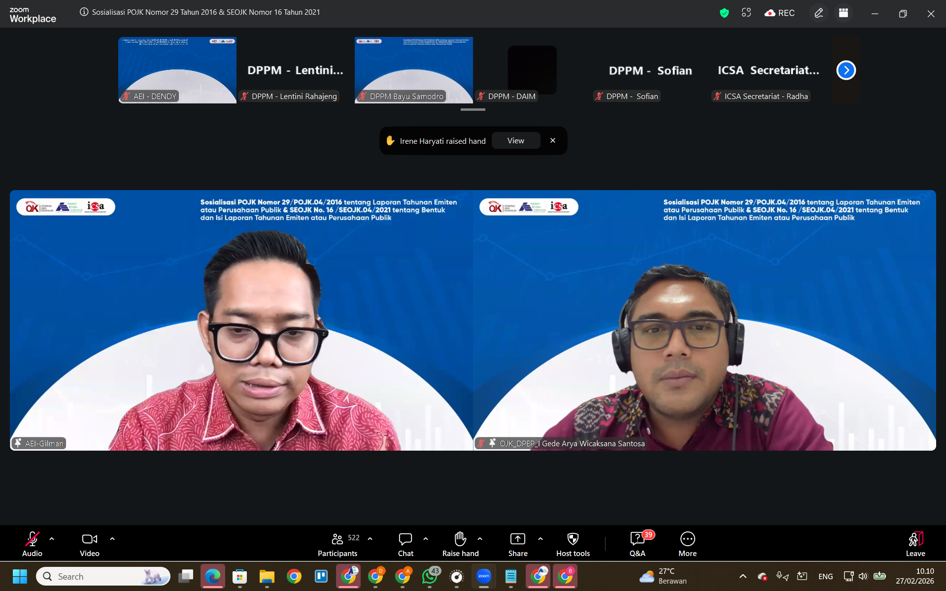 Kegiatan yang dilaksanakan secara daring pada Jumat, 27 Februari 2026 ini berfokus pada pendalaman Peraturan Otoritas Jasa Keuangan Nomor 29/POJK.04/2016 tentang Laporan Tahunan Emiten atau Perusahaan Publik serta Surat Edaran Otoritas Jasa Keuangan Nomor 16/SEOJK.04/2021 mengenai bentuk dan isi Laporan Tahunan.